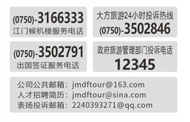 地址:廣東省江門市蓬江區建設三路19號2幢緯豐廣場12樓 旅行社的名稱:江門市大方旅游國際旅行社有限公司 許可證編號:L-GD-CJ00121