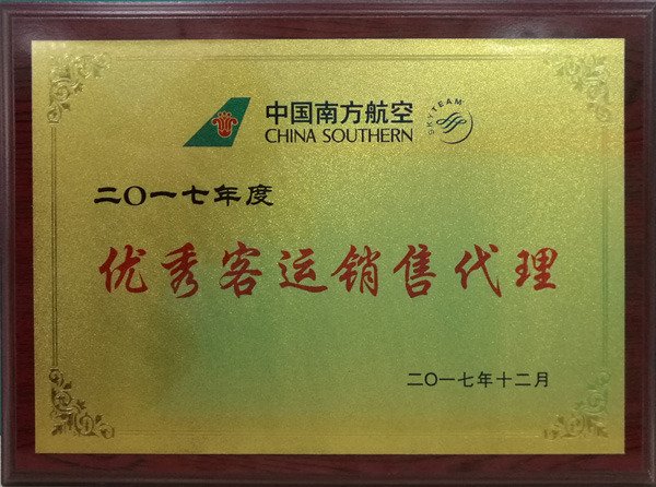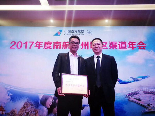 日前,在廣州召開的“2017年南航廣州地區渠道年會”上,我司再次獲得中國南方航空股份有限公司頒發《2017年度優秀客運銷售代理》獎。