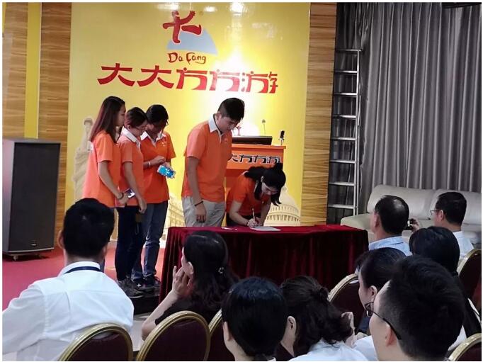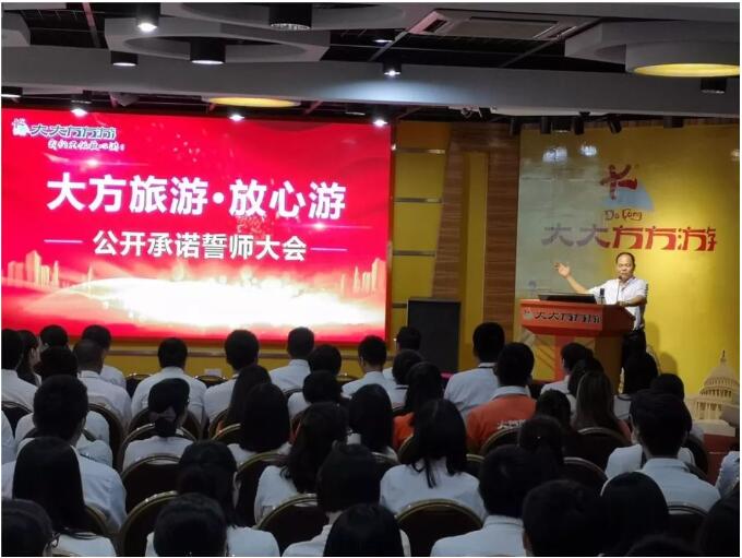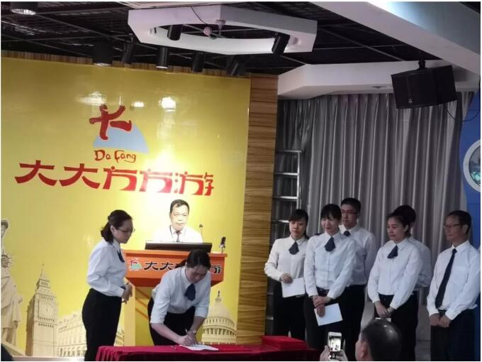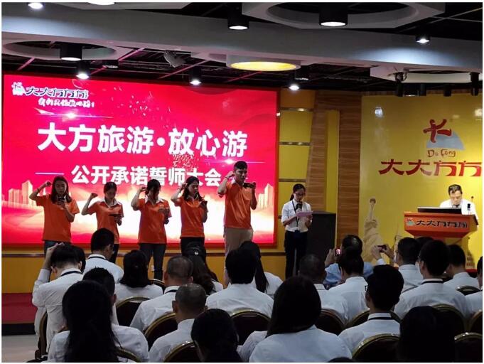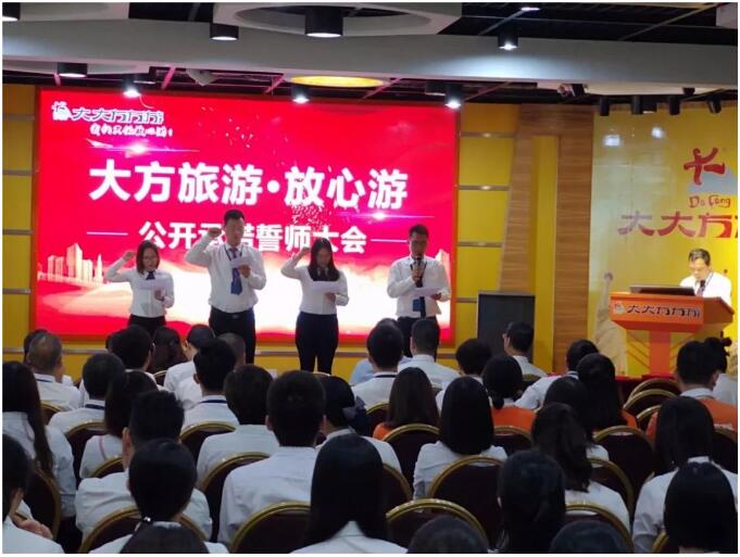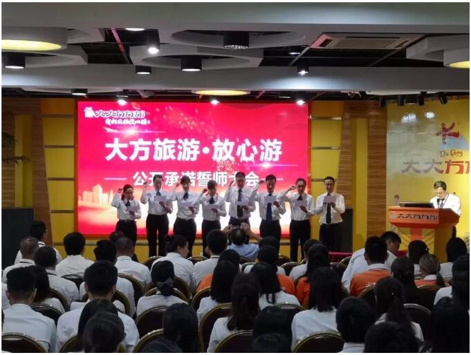 大方旅游全體工作人員,包括前線的導游、司機,后勤支援的計調、銷售,還有集團管理層,都參與了誓師大會。現場氣氛熱情高漲,同事們滿懷士氣,信心滿滿地上臺,宣讀他們的承諾!