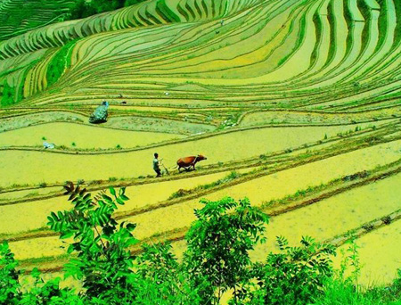 從高處望去,龍脊梯田展現(xiàn)了動(dòng)人心魄的曲線(xiàn)美。 龍脊梯田始建于元朝,完工于清初,距今已有650多年歷史。山腳盤(pán)繞到山頂,小山如螺,大山似塔,層層疊疊,高低錯(cuò)落。從高處望去,梯田的優(yōu)美曲線(xiàn)一條條、一根根、或平行或交叉,展現(xiàn)了動(dòng)人心魄的曲線(xiàn)美。春季,農(nóng)民開(kāi)始往梯田灌水育苗,整個(gè)梯田景區(qū)一片生機(jī)勃勃的景象。