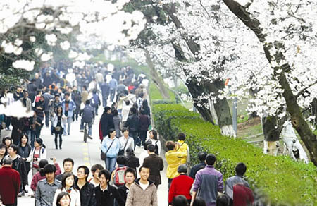每年陽(yáng)春三月,在被譽(yù)為“中國(guó)最美的大學(xué)”武漢大學(xué)內(nèi),春天的氣息吹拂山野,也喚醒沉睡了一年的櫻花。校園內(nèi)的1000多株櫻花競(jìng)相綻放,一株株,一排排,白如霜雪,燦若云霞,如朵朵輕飛的云,十分絢麗奪目,使原來(lái)寧?kù)o的校園成了一個(gè)熱鬧的春天公園。從學(xué)校正門(mén)牌坊到珞伽山的校道上,擠滿(mǎn)了興高采烈、成群結(jié)隊(duì)前來(lái)賞櫻的人們,處處花似海、人如潮。