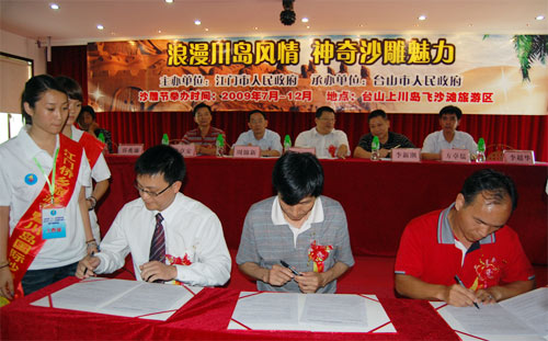 為了更好、更充分地促進客源,臺山市旅游局、新思路策劃機構有限公司以及江門市大方旅游國際旅行社有限公司三方就沙雕節(jié)期間的游客互動簽訂《合作意向書》。