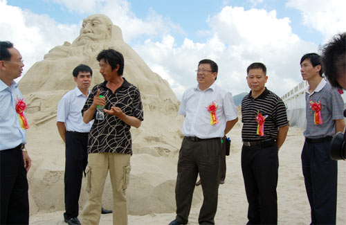 國際沙雕藝術家張永康向李崴副市長一行領導介紹沙雕情況 |
