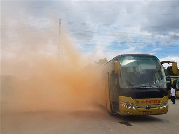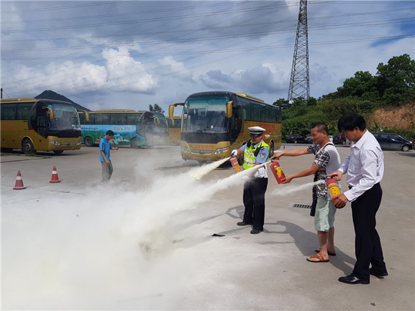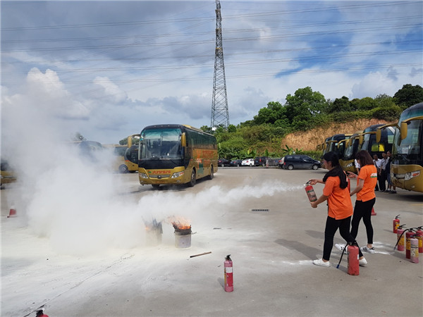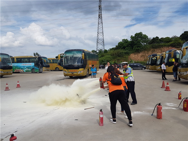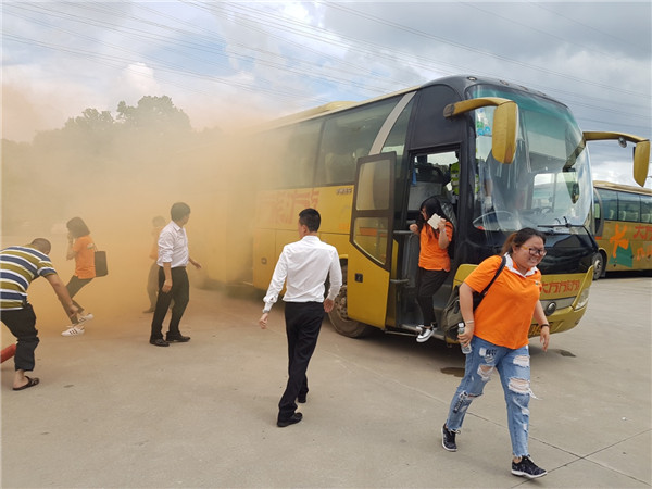 下午4時整,演練正式開始,演練假設:旅游巴突然故障起火,情況危急。現場應急處置:司機立即撥打 “110”報警,同時報告公司;導游組織游客迅速撤離到安全地帶,同時啟動應急滅火疏散預案。游客在導游和司機的帶領及指引下,按照逃生路線從前后車門或逃生窗口或安全車窗有序撤離逃生。撤離到安全地帶后導游及時清點人數報告公司,同時協助到場的醫護人員對受傷游客進行及時救治。司機導游在現場實地使用了滅火器進行撲救,確保所有一線服務人員掌握消防滅火器的使用及旅游大巴的應急逃生方法。