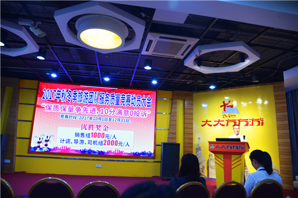 大會最后,常務副總經理黃冠明上臺為秋冬季服務質量競賽活動作總動員。“保質保量爭先進,10分滿意0投訴”,是大方旅游2017年秋冬旅游團隊服務質量的目標,我們一定全力以赴,做到最好!