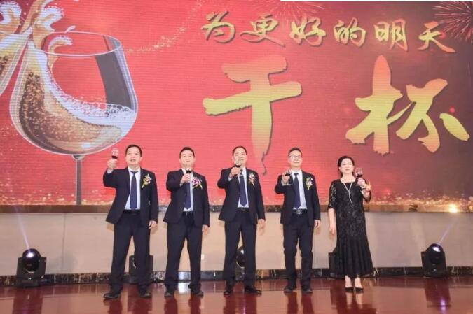 隨后,黃冠明副總(下圖右二)、林超副總(下圖左二)、胡振軍副總(下圖左一)、梁敏副總(下圖右一)上臺與董事長林棟禮先生(圖中)舉杯祝酒,預(yù)祝大方旅游在2019年再創(chuàng)輝煌!