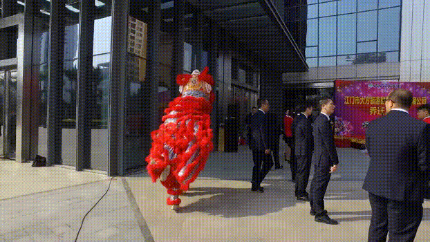 威風凜凜的舞獅隊送來了吉祥和祝福。林棟禮董事長、黃劍恒常務副總經理上臺為金獅點睛,寓意公司龍精虎猛、生意興!