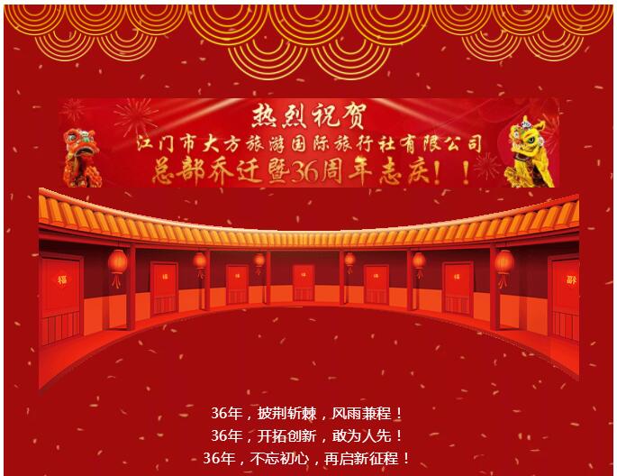 自1983年創立至今,大方旅游已扎根江門36載。在新的一年,為配合企業轉型升級的需要,以全新形象迎接新一輪的發展,優化客人的旅游體驗,大方旅游總部于2019年2月23日正式喬遷至蓬江區建設三路19號2幢緯豐廣場12樓,共2500平方米的新寫字樓!